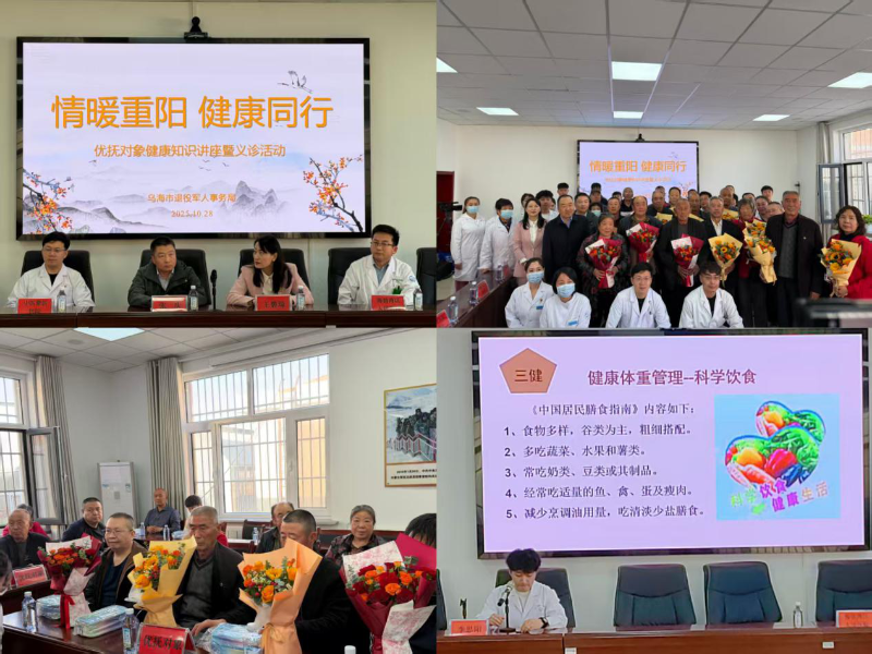 往日的艰苦奋战和辛勤付出,在各位退役老兵、优抚对象身上刻下了荣光的印记,也留下了岁月的风霜。基于对他们身体健康的牵挂,市退役军人事务局特别联合中医蒙医医院、海勃湾区人民医院、第一口腔医院、旭升眼科医院开展“情暖重阳 健康同行”优抚对象健康知识讲座暨义诊活动,为健康保驾护航,将尊崇与关爱真正落到实处。活动现场,第一口腔医院为优抚对象送上口腔护理套盒,市退役军人事务局工作人员向优抚对象献花。随后,海勃湾区人民医院李思阳医生带来健康知识讲座,中医蒙医医院、海勃湾区人民医院、第一口腔医院、旭升眼科医院医护人员们为优抚对象一对一测量血压、问诊、理疗,为大家的健康问题答疑解惑。此次活动不仅为优抚对象送上了节日温暖与健康守护,更是一次贴近需求、倾听心声的务实之举。