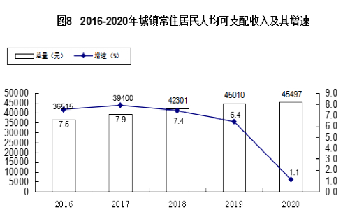 城乡常住居民收入继续增加。全市全体居民人均可支配收入45133元,比上年增长1.7%。按常住地分,城镇常住居民人均可支配收入45497元,比上年增长1.1%;农村牧区常住居民人均可支配收入21812元,比上年增长7.5%。