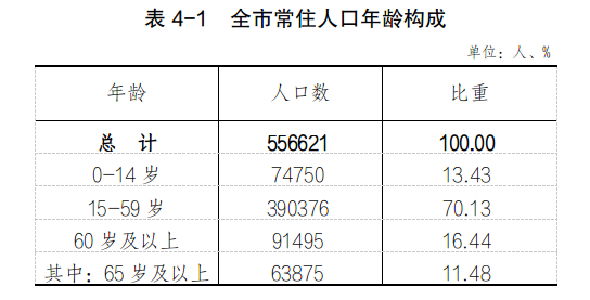 全市常住人口[2]中,0-14岁[3]人口为74750 人,占13.43%;15-59岁人口为390376 人,占70.13 %;60岁及以上人口为91495 人,占 16.44%,其中65岁及以上人口为 63875 人,占11.48 %。与2010年第六次全国人口普查相比,0-14岁人口的比重下降0.50个百分点;15-59岁人口的比重下降5.42个百分点;60岁及以上人口的比重上升5.93个百分点,65岁及以上人口的比重为上升4.55个百分点。