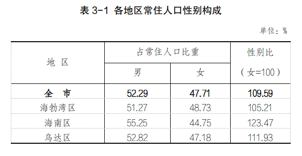 全市常住人口[2]中,男性人口为291044人,占 52.29%;女性人口为265577人,占47.71 %。常住人口性别比(以女性为100,男性对女性的比例)为109.59,与2010年第六次全国人口普查的112.72相比,下降3.13 。