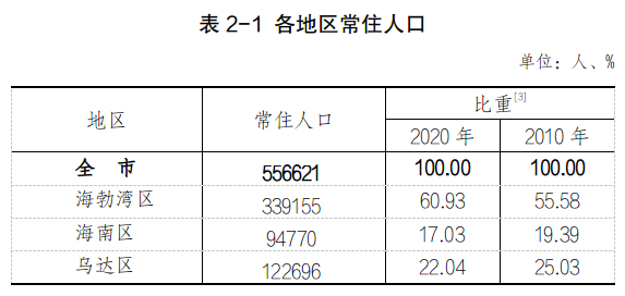 与2010年第六次全国人口普查相比,三区中有两个区人口减少,为海南区和乌达区,分别减少8585人和10674人。海勃湾区增加42978人。