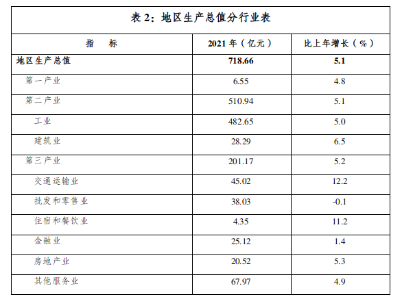 初步核算,全市实现地区生产总值718.66亿元,按可比价格计算,比上年增长5.1%。其中,第一产业增加值6.55亿元,增长4.8%;第二产业增加值510.94亿元,增长5.1%;第三产业增加值201.17亿元,增长5.2%。三次产业结构为0.9:71.1:28.0。