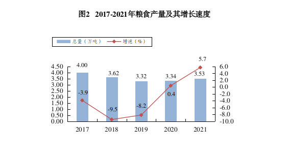 全年农作物总播种面积5689.89公顷,比上年下降0.2%。其中:粮食作物播种面积4634公顷,增长7.1%;经济作物播种面积1055.89公顷,下降23.1%。粮食总产量3.53万吨,增长5.7%;油料产量136.80吨,下降68.4%;蔬菜及食用菌产量3.96万吨,下降14.4%;瓜果类产量0.26万吨,增长3.1%。园林水果产量1.66万吨,增长19.9%。