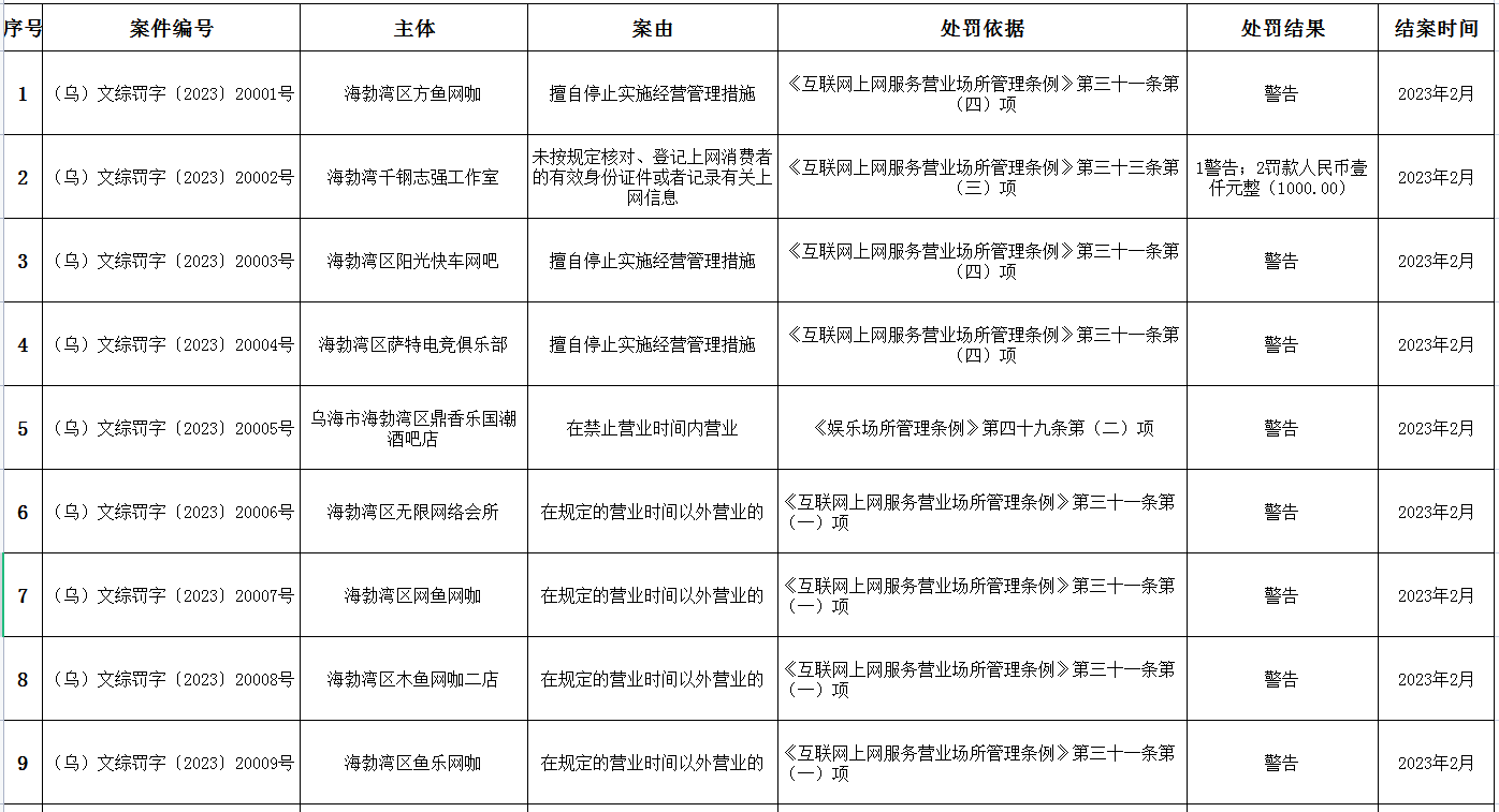2023年海勃湾区执法案件公示