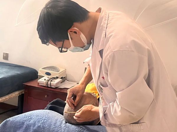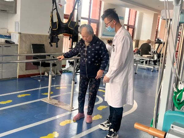 “大爷,现在呼吸感觉怎么样?手臂腿部能活动吗?”这是一位康复治疗师正在病床边为脑梗患者进行康复治疗,通过伸展手臂和腿部来减轻肌张力障碍,改善运动功能。