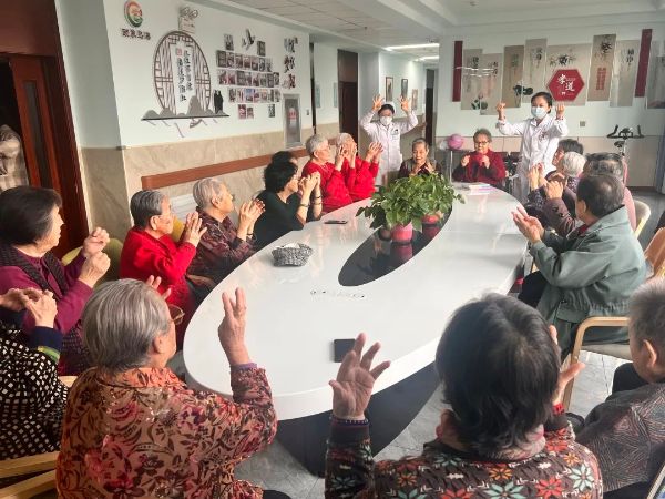 “来,我们大家一起做手指操,看看谁做得最标准……”在老年人活动区域,处处可见适老化设施,多位老人围聚在一起,在工作人员的带领下做起了手指操。大家兴高采烈,现场气氛融洽欢乐。