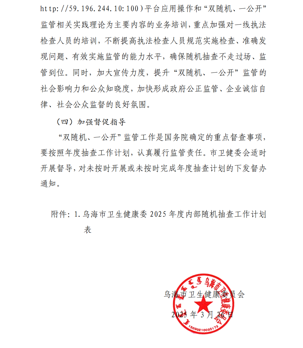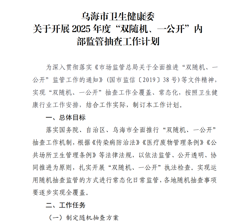 | 标 题 | 乌海市卫生健康委关于开展 2025 年度“双随机、一公开”内部监管抽查工作计划 | ||||||||